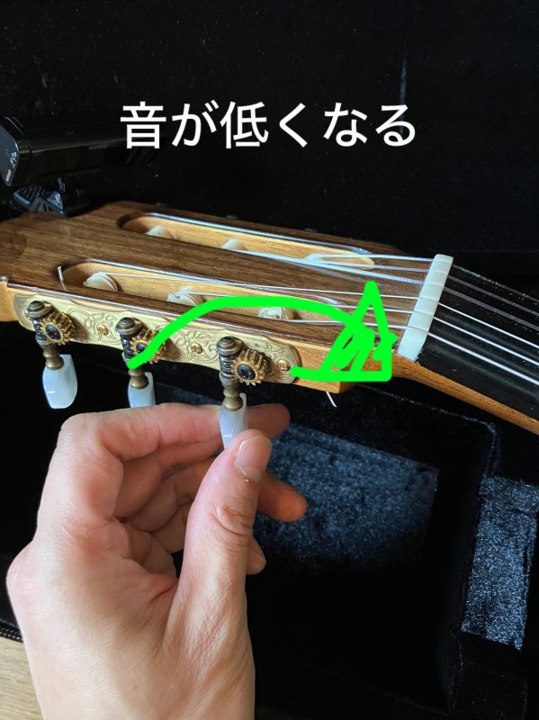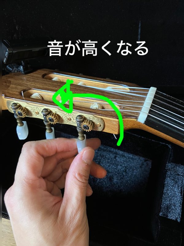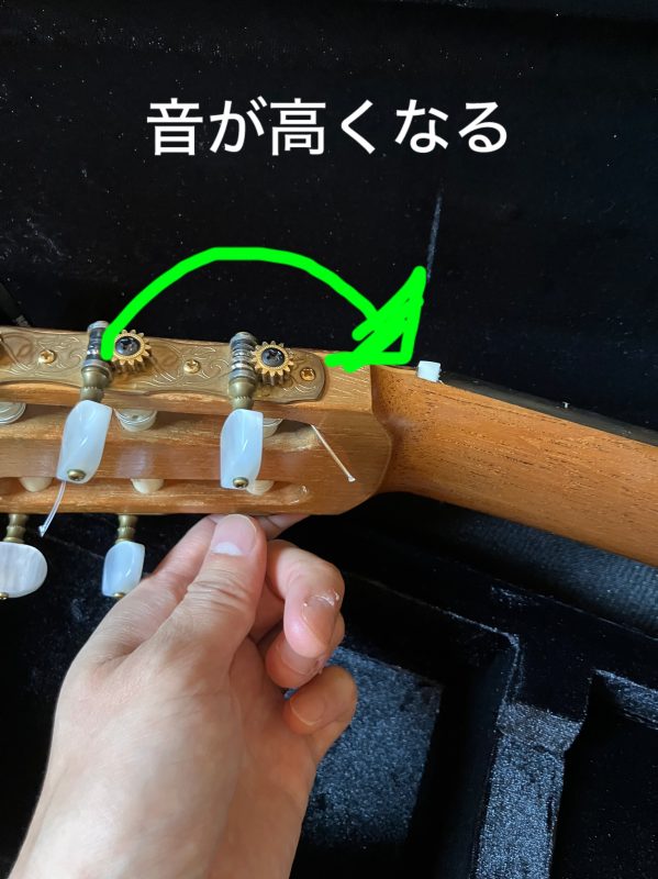 6弦〜4弦のペグは反時計周りに回すと音が高くなります。